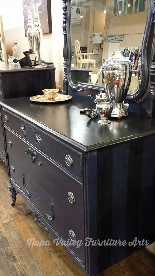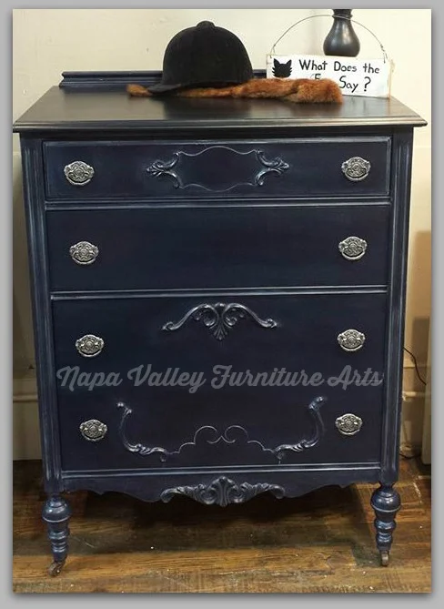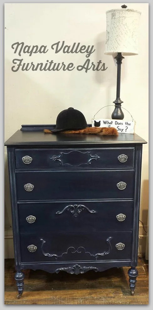 This fabulous dresser set is painted with General Finishes Coastal Blue and Lamp Black milk paint, with black and blue stripes on the sides. They are both finished in General Finishes High Performance Top Coat and the details were then highlighted with Miss Mustardseed's White Wax.