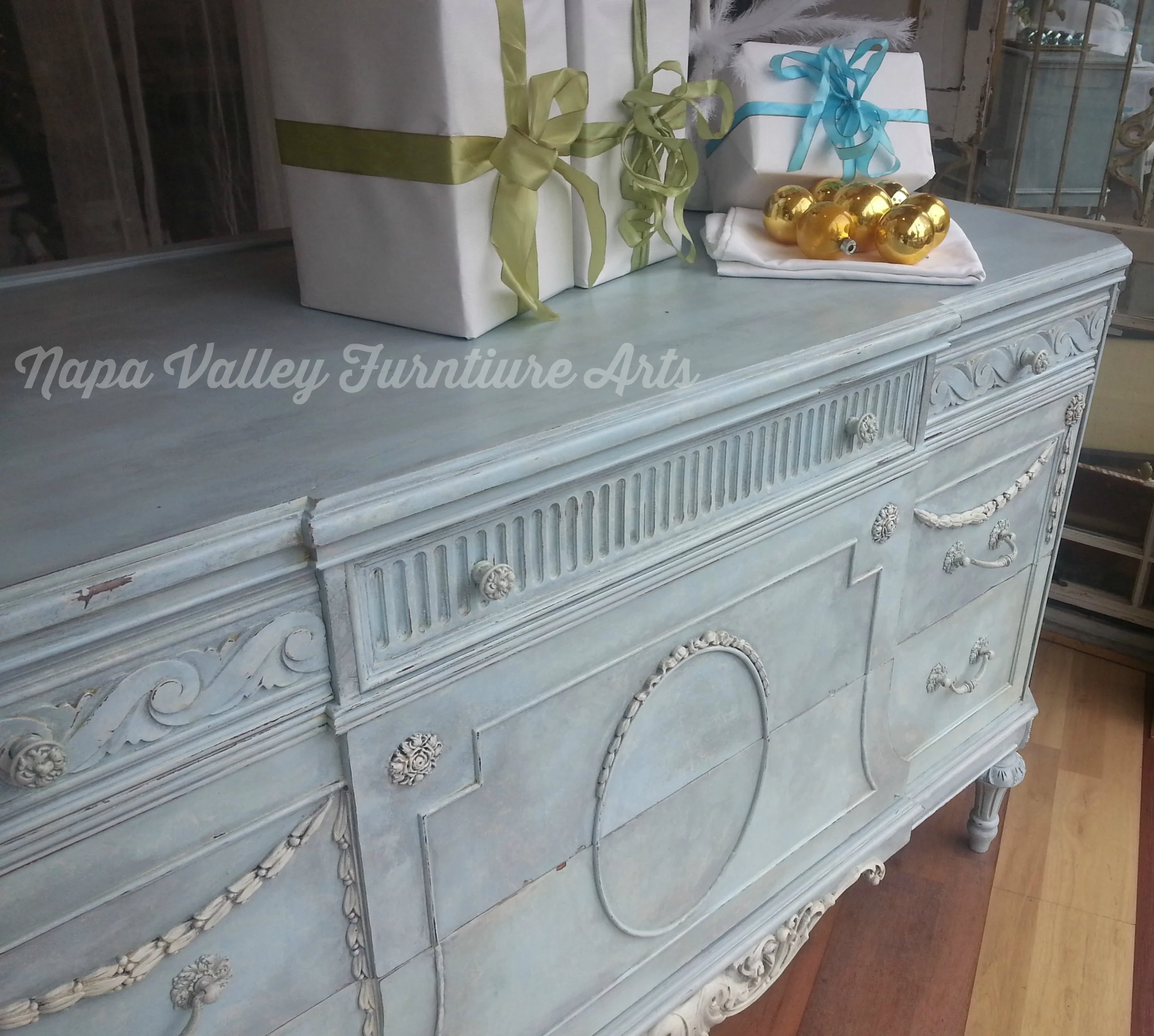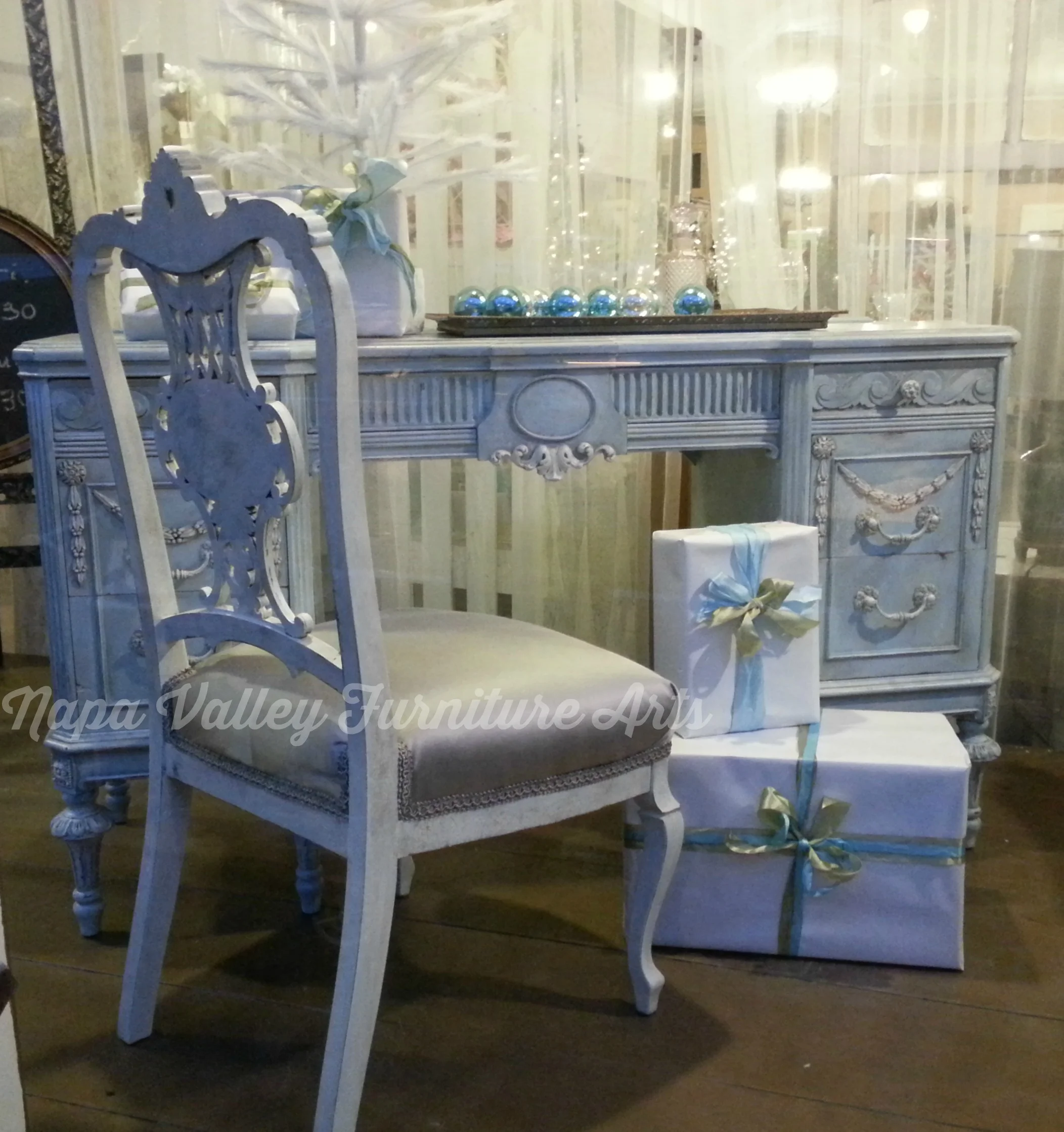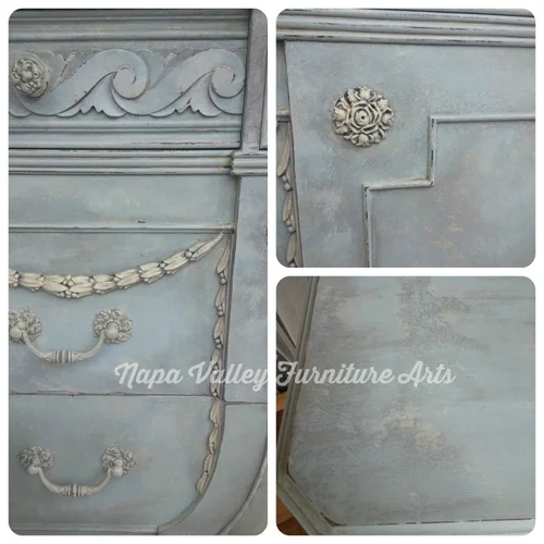 This fabulous set included a dresser, vanity, chair, mirror, and two twin beds. It was painted in antique white home-made chalk paint, Maison Blanche antique blue, with General Finishes glaze in a custom grey and High Endurance top coat. I also used Artisan Enhancements Crackle Tex to get the great patina.