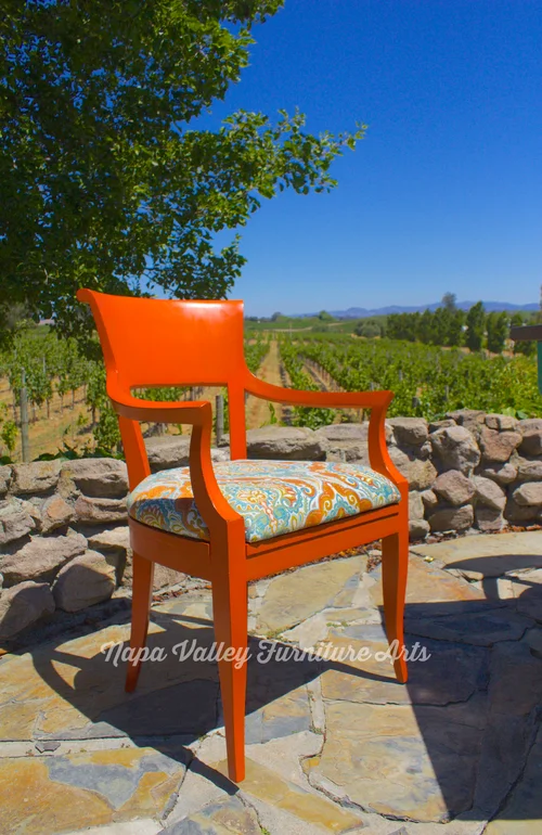 The chairs were painted in General Finishes Persimmon with Van Dyke Brown glaze and High Performance Top Coat. The table base was painted Dark Chocolate and then Patina, with distressing to show the dark chocolate underneath. It was also glazed with Van Dyke Brown, and then waxed with their Finishing Wax. The table top was replaced with recycled redwood from a 100 year old water tower. It was stained with antique walnut stain, and then finished with several layers of General Finishes Wipe On Urethane Top Coat.